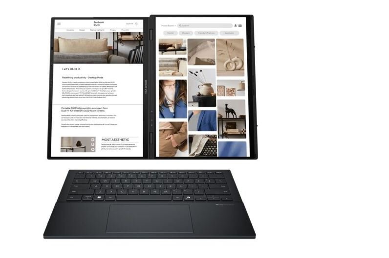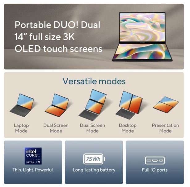 Asus Zenbook Duo UX8406CA OLEDS9321M Ultra 9 285H 32GB M2 2TB 14″ 3K OLED Touch VGA Intel Arc W11H OHS M365
