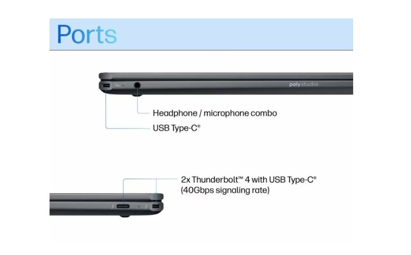 Ports : 2xThunderbolt 4 with USB Type-C 40Gbps signaling rate (USB Power Delivery, DisplayPort 2.1, HP Sleep and Charge); 1 headphone/microphone combo; 1 USB Type-C 10Gbps signaling rate (USB Power Delivery, DisplayPort 1.4a, HP Sleep and Charge)